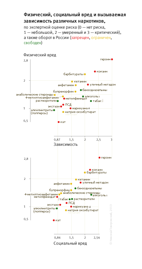 «Факт, который правительства мира стараются не афишировать, состоит в том, что никотин и алкоголь являются одними из наиболее опасных наркотиков, изобретенных человечеством. Наркотики, изображенные на прикрепленном графике из Википедии, расположены по следующему принципу: чем выше наркотик на картинке, тем выше уровень зависимости от него. Чем правее, тем выше его смертельность, то есть соотношение обычной дозы к смертельной.