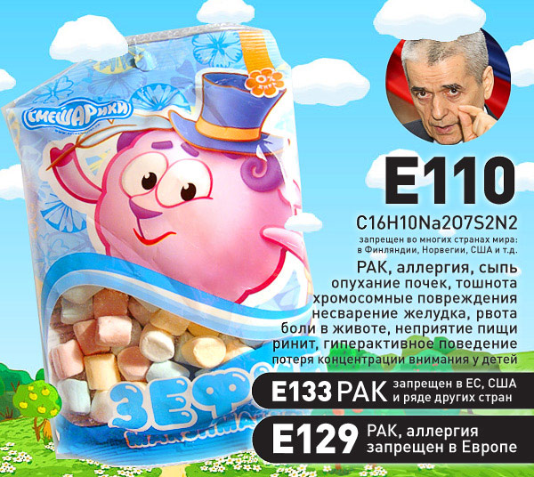 Ну ладно Гонконгская компания-производитель. У них понятно, что ничего святого с 1970 года. Но наши-то? Вездесущий Онищенко, например? ПОЧЕМУ РАЗРЕШЕНЫ И ДОБАВЛЯЮТСЯ КРАСИТЕЛИ ИМЕННО С ЭТИМИ СВОЙСТВАМИ? ЧТО ЭТО, КАК НЕ МАССОВОЕ УБИЙСТВО РОССИЙСКИХ ДЕТЕЙ? КТО В ОТВЕТЕ??